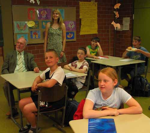 Ein Foto in der Klasse 5 b der Hauptschule. Die Schülerinnen und Schüler haben mich zu einem Gegenbesuch in ihrer Klasse eingeladen, mir einen gesunden Frühstückstisch gedeckt; wir haben zusammen gefrühstückt; sie hatten ein Lied für mich gedichtet und vorgetragen. Anschließend durfte ich eine Stunde "Deutsch" mit ihnen verbringen. Ich war von der besonderen Fähigkeit der Lehrerin, Frau Meurer, die Konzentration der Schüler auf den Stoff zu richten und den Umgang der Schüler unter einander bei der Erarbeitung des Stoffes stark beeindruckt.