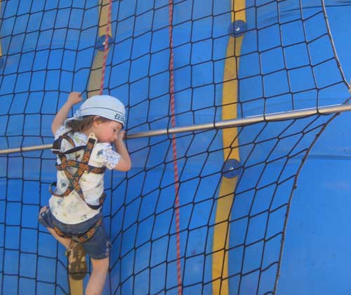 Das kleine Mädchen im Netz ist Lina (bald 5), meine Enkeltochter, als sie die 8 m hohe Kletterturm-Wand bezwungen hat.